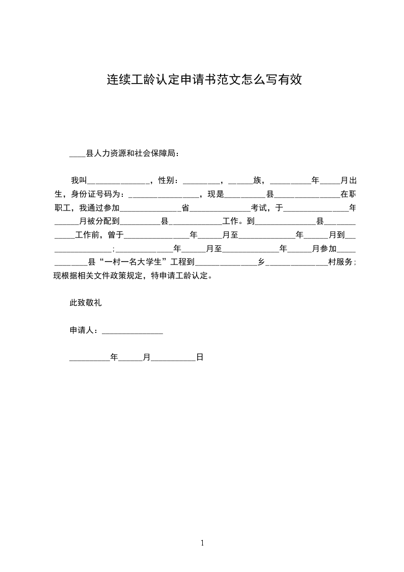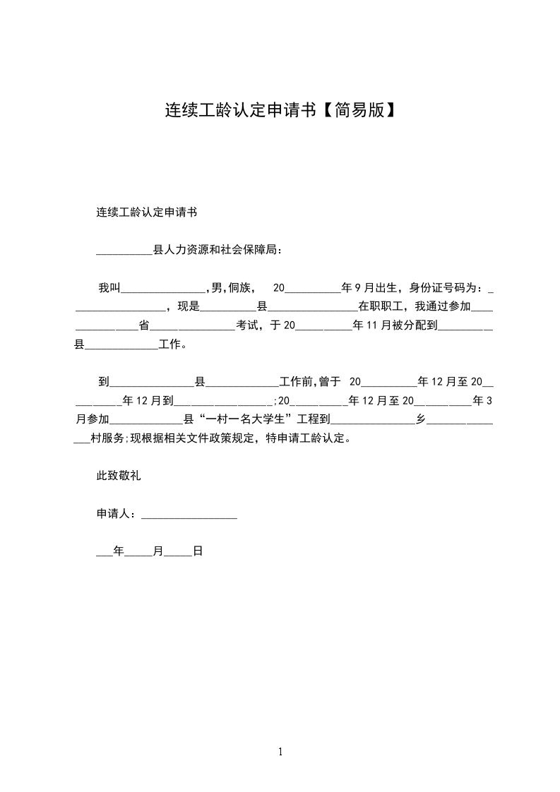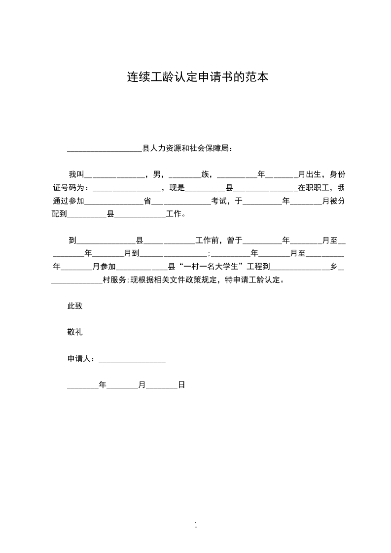 我叫_______________,性别:_________,______族,__________年_____月出生,身份证号码为:_________________,现是__________县________________在职职工,我通过参加_______________省_______________考试,于________________年______月被分配到__________县_____________工作。到_______________县_____________工作前,曾于________________年______月至______________年______月到_________________;______________年______月至______________年______月参加_____________县“一村一名大学生”工程到_______________乡_______________村服务;现根据相关文件政策规定,特申请工龄认定。
