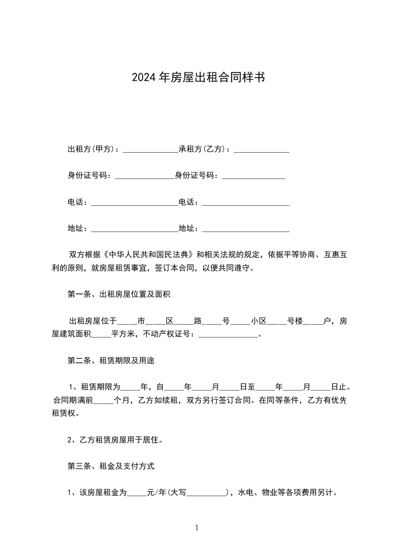 1、租赁期限为_____年,自_____年_____月_____日至_____年_____月_____日止。合同期满前_____个月,乙方如续租,双方另行签订合同。在同等条件,乙方有优先租赁权。