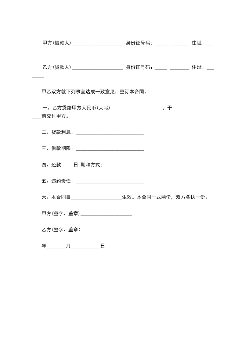甲方(借款人)_____________________ 身份证号码:_____ ________ 住址:________