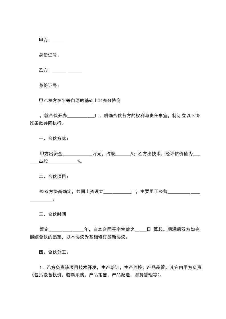 ,就合伙开办____________厂,明确合伙各方的权利与责任事宜,特订立以下协议条款共同执行。