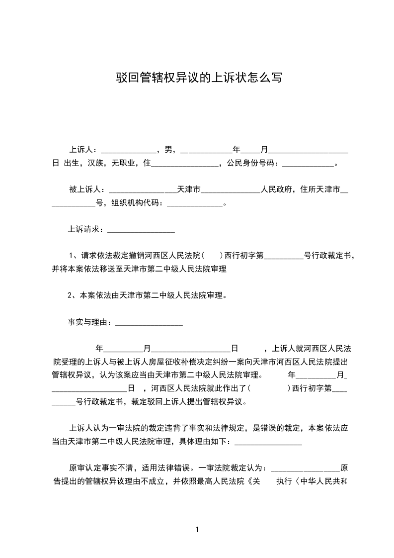 年__________月____________________日 ,上诉人就河西区人民法院受理的上诉人与被上诉人房屋征收补偿决定纠纷一案向天津市河西区人民法院提出管辖权异议,认为该案应当由天津市第二中级人民法院审理。 年__________月____________________日 ,河西区人民法院就此作出了( )西行初字第__________号行政裁定书,裁定驳回上诉人提出管辖权异议。