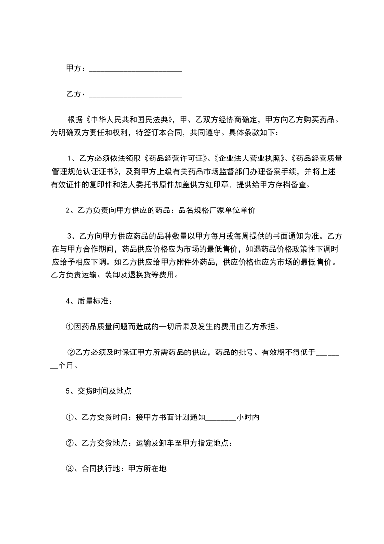 根据《中华人民共和国民法典》,甲、乙双方经协商确定,甲方向乙方购买药品。为明确双方责任和权利,特签订本合同,共同遵守。具体条款如下: