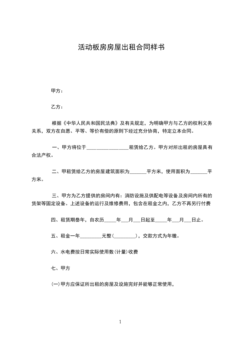 活动板房房屋出租协议样书