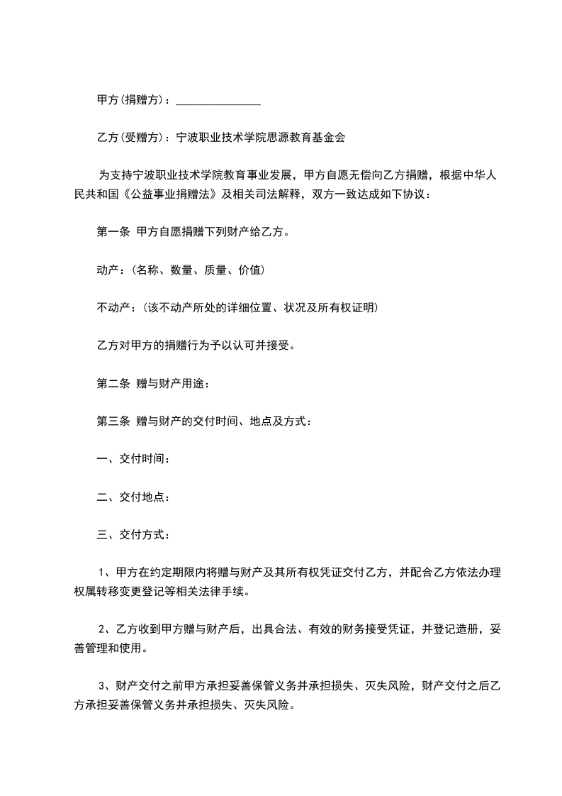 为支持宁波职业技术学院教育事业发展,甲方自愿无偿向乙方捐赠,根据中华人民共和国《公益事业捐赠法》相关司法解释,双方一致达成如下协议: