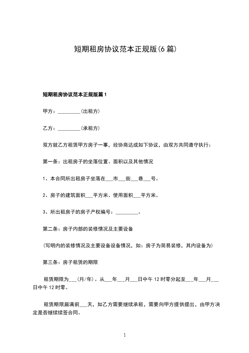 短期租房协议范本正规版篇1