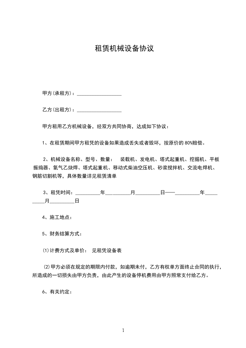 6.机械的进退场费:机械的进出场运输由出租方负责办理,承租方协助装卸车。机械的进出场费全部由承租方承担。