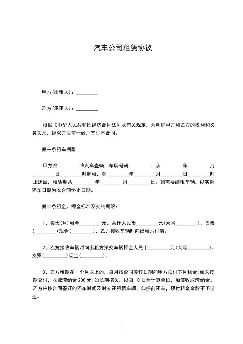 1、每天(月)租金_________元。共计人民币_________元(大写_________),支票(_________)现金(_________),乙方接收车辆时向出租方付清。
