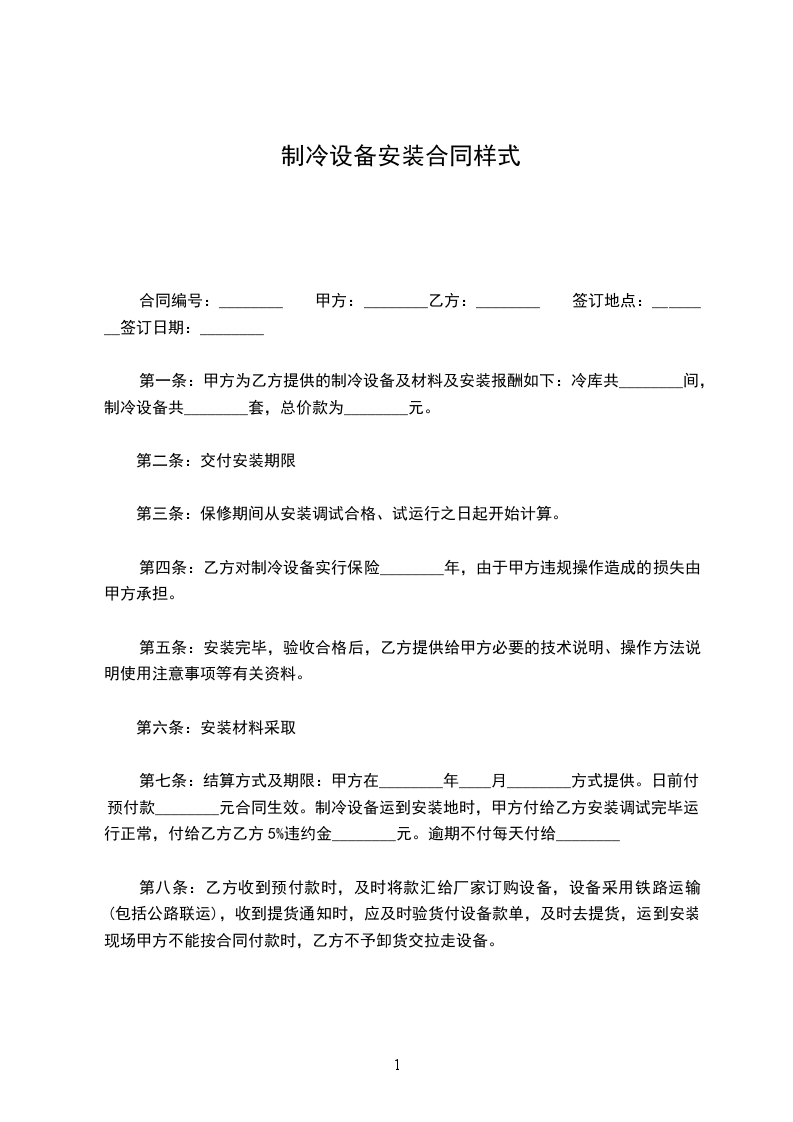 第一条:甲方为乙方提供的制冷设备及材料及安装报酬如下:冷库共________间,制冷设备共________套,总价款为________元。