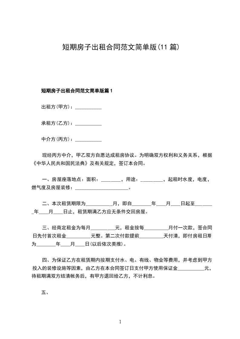 短期房子出租合同范文简单版篇1