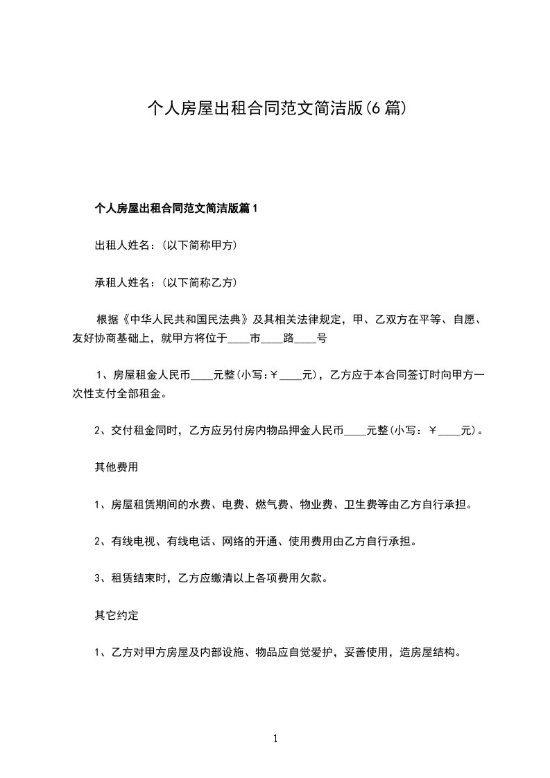 个人房屋出租合同范文简洁版篇1
