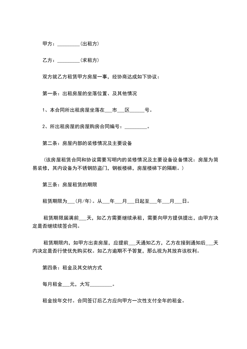 1、该房屋租赁期共一年。自_____年_____月_____日起至_____年_____月_____日止。