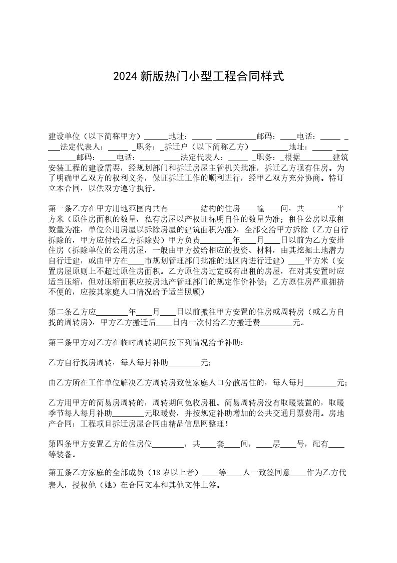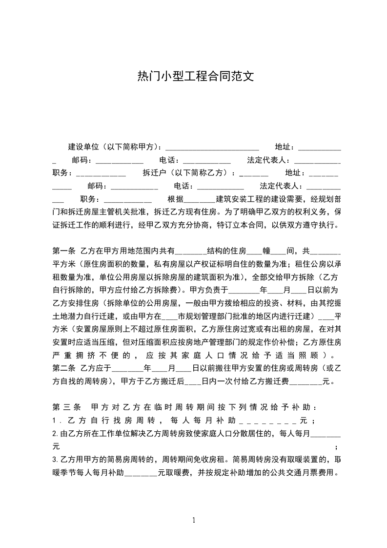建设单位(以下简称甲方)_________________ 地址:____________________________________ 邮码:_______________ 电话:_______________ 法定代表人:____________ 职务:____________ 拆迁户(以下简称乙方)____________________ 地址:____________________________________ 邮码:_______________ 电话:_______________ 法定代表人:____________ 职务:____________ 根据________建筑安装工程的建设需要,经规划部门和拆迁房屋主管机关批准,拆迁乙方现有住房。为了明确甲乙双方的权利义务,保证拆迁工作的顺利进行,经甲乙双方充分协商。特订立本合同,以供双方遵守执行。