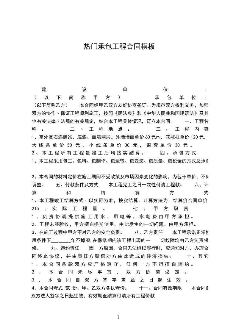 (以下简称乙方) 本合同经甲乙双方友好协商签订。为规范双方权利义务,加强双方的协作﹑保证工程顺利施工,按照《民法典》和《中华人民共和国建筑法》及其他有关法律﹑法规的有关规定,结合本工程具体情况,订立本合同。 一、工程名称: 二﹑工程地点: 三、工程内容