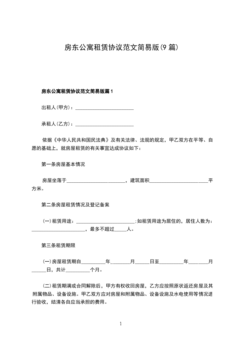房东公寓租赁协议范文简易版篇9
