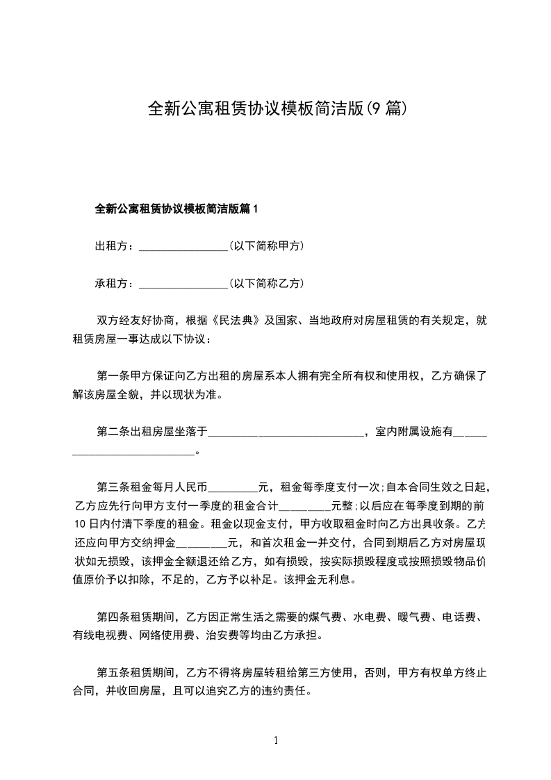 全新公寓租赁协议模板简洁版篇9