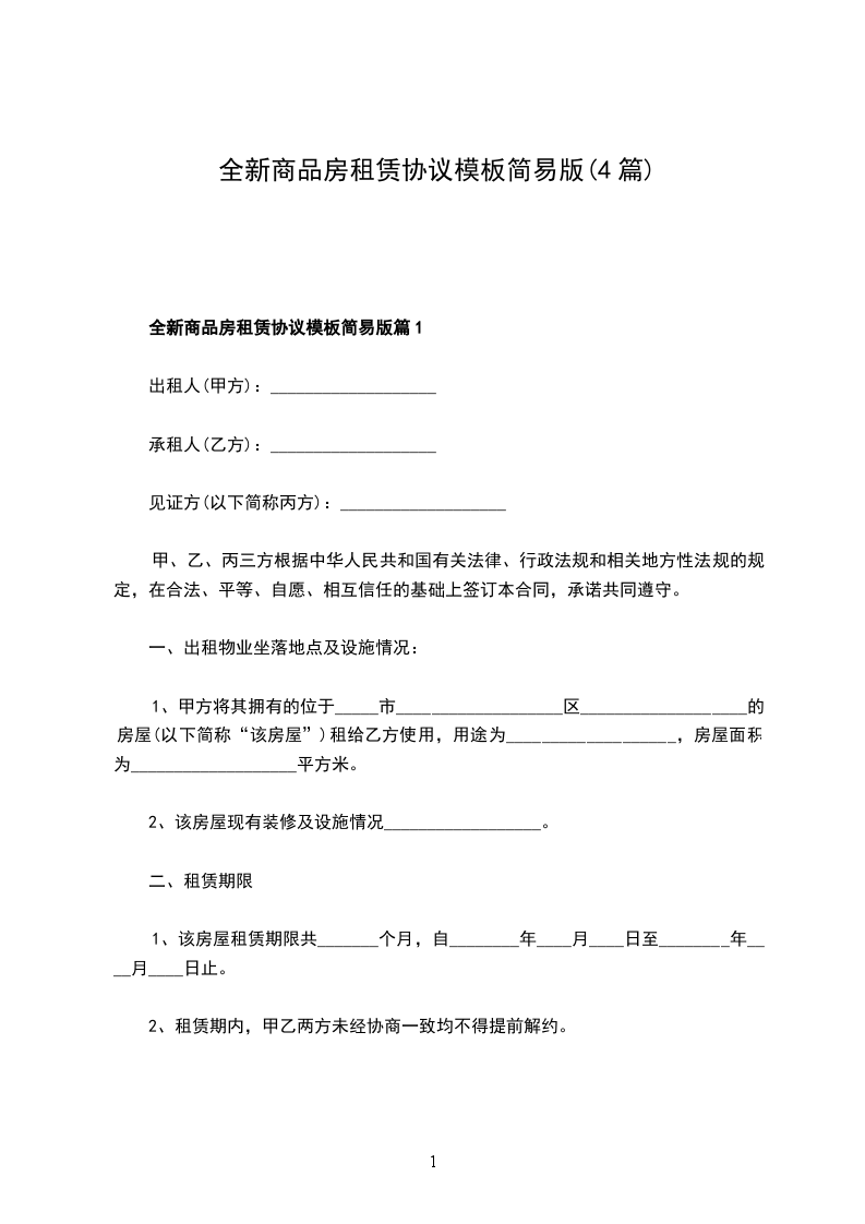 全新商品房租赁协议模板简易版篇1