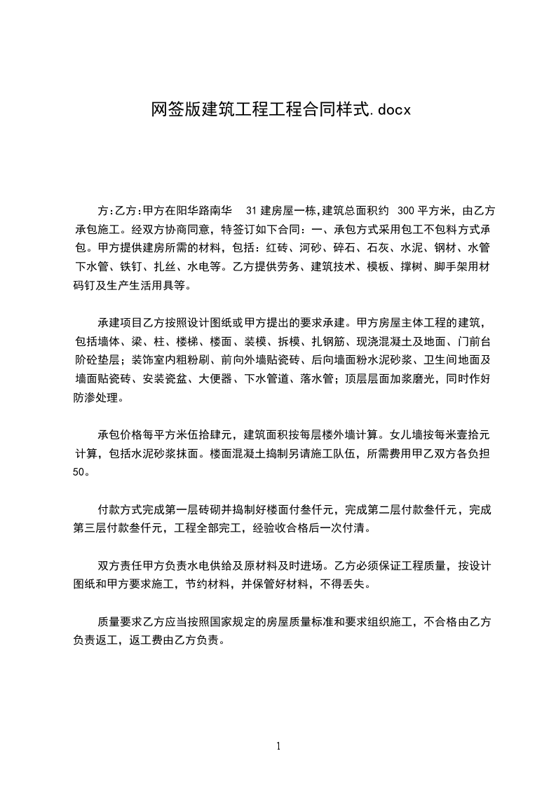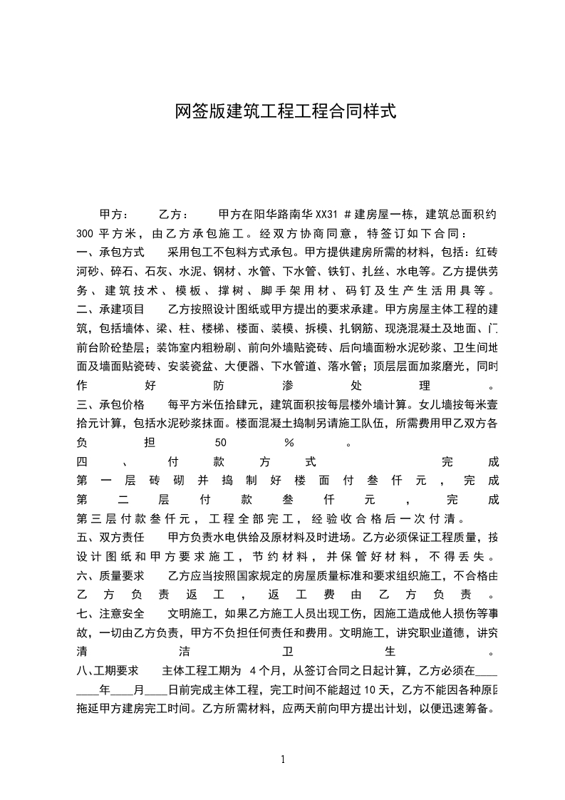 甲方: 乙方: 甲方在阳华路南华XX31#建房屋一栋,建筑总面积约300平方米,由乙方承包施工。经双方协商同意,特签订如下合同: