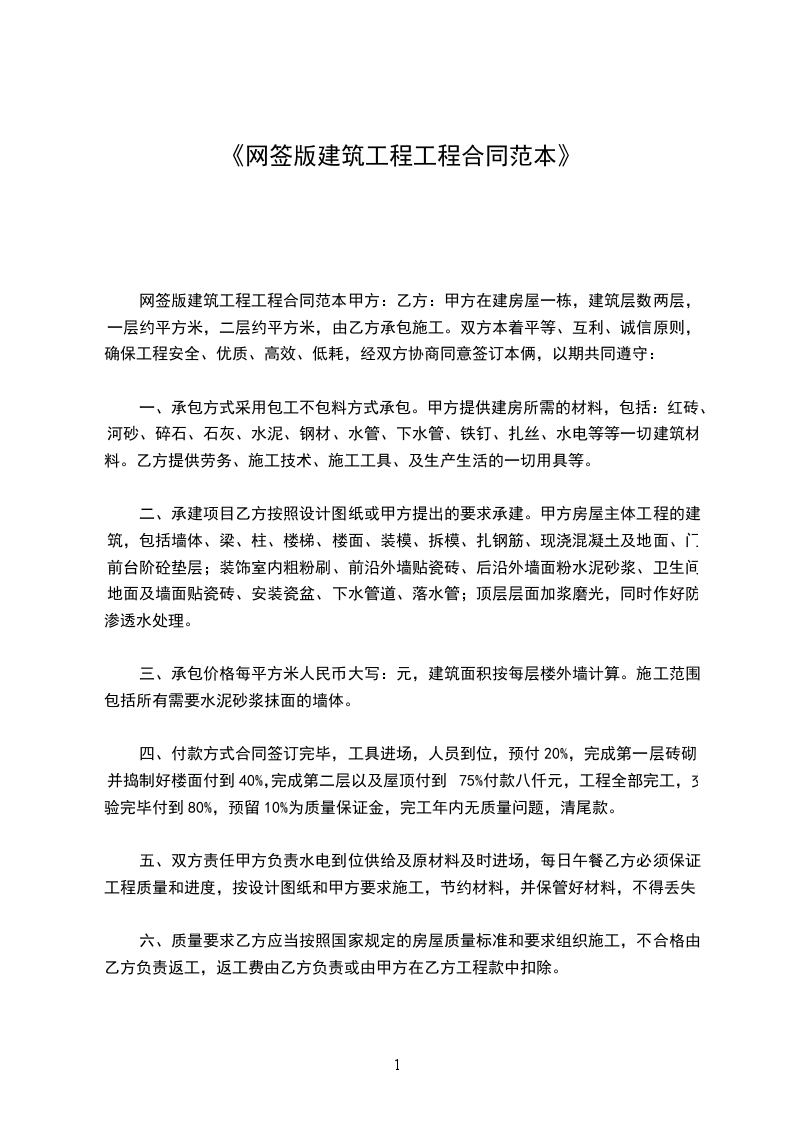 一、承包方式 采用包工不包料方式承包。甲方提供建房所需的材料,包括:红砖、河砂、碎石、石灰、水泥、钢材、水管、下水管、铁钉、扎丝、水电等。乙方提供劳务、建筑技术、模板、撑树、脚手架用材、码钉及生产生活用具等。