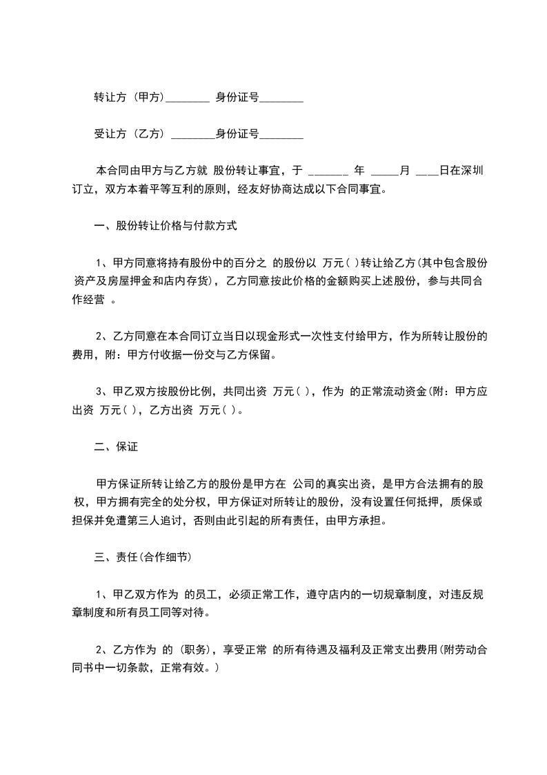 1、甲方同意将持有股份中的百分之 的股份以 万元( )转让给乙方(其中包含股份资产及房屋押金和店内存货),乙方同意按此价格的金额购买上述股份,参与共同合作经营 。