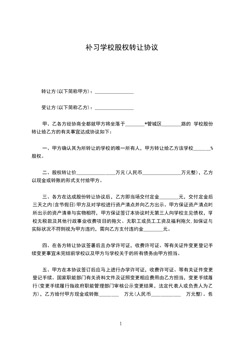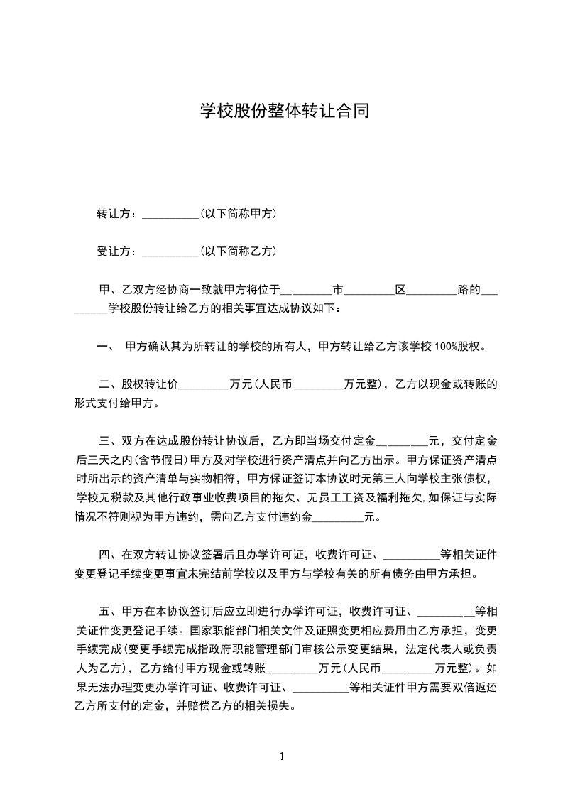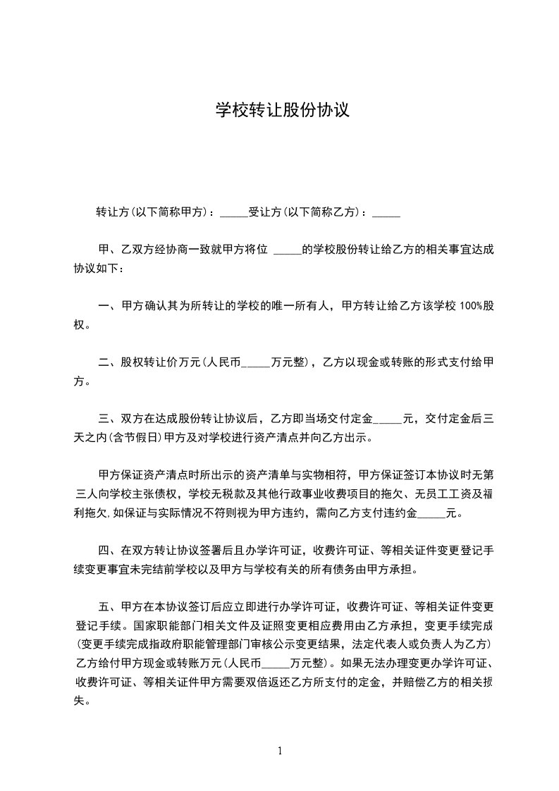 三、双方在达成股份转让协议后,乙方即当场交付定金 元,交付定金后三天之内(含节假日)甲方及对学校进行资产清点并向乙方出示。甲方保证资产清点时所出示的.资产清单与实物相符,甲方保证签订本协议时无第三人向学校主张债权,学校无税款及其他行政事业收费项目的拖欠、无员工工资及福利拖欠,如保证与实际情况不符则视为甲方违约,需向乙方支付违约金 元。