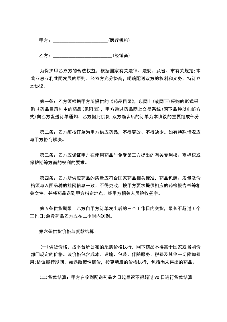 3、结算方式:大批量采购(一次药品价款5万元以上)实行批次据实结算,平常零星采购实行季度末结算,乙方应向甲方提交对已交易药品的发票和有关单据。