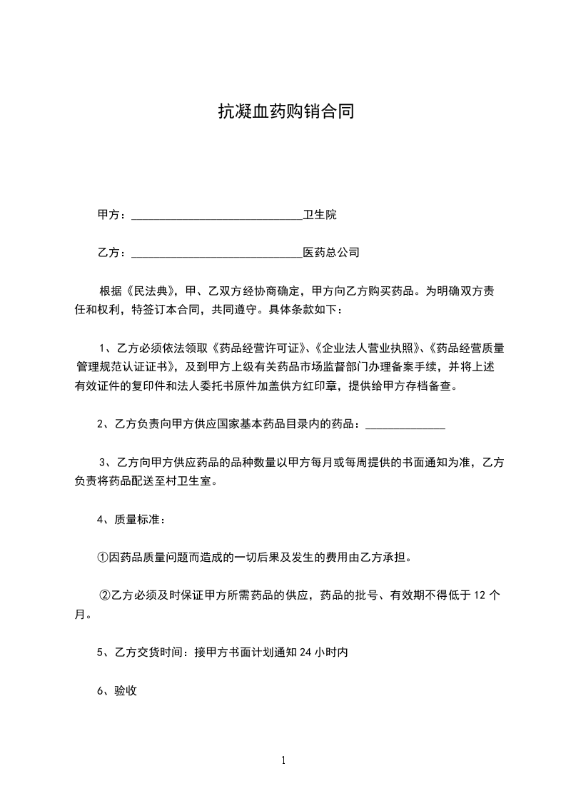 根据《民法典》,甲、乙双方经协商确定,甲方向乙方购买药品。为明确双方责任和权利,特签订本合同,共同遵守。具体条款如下: