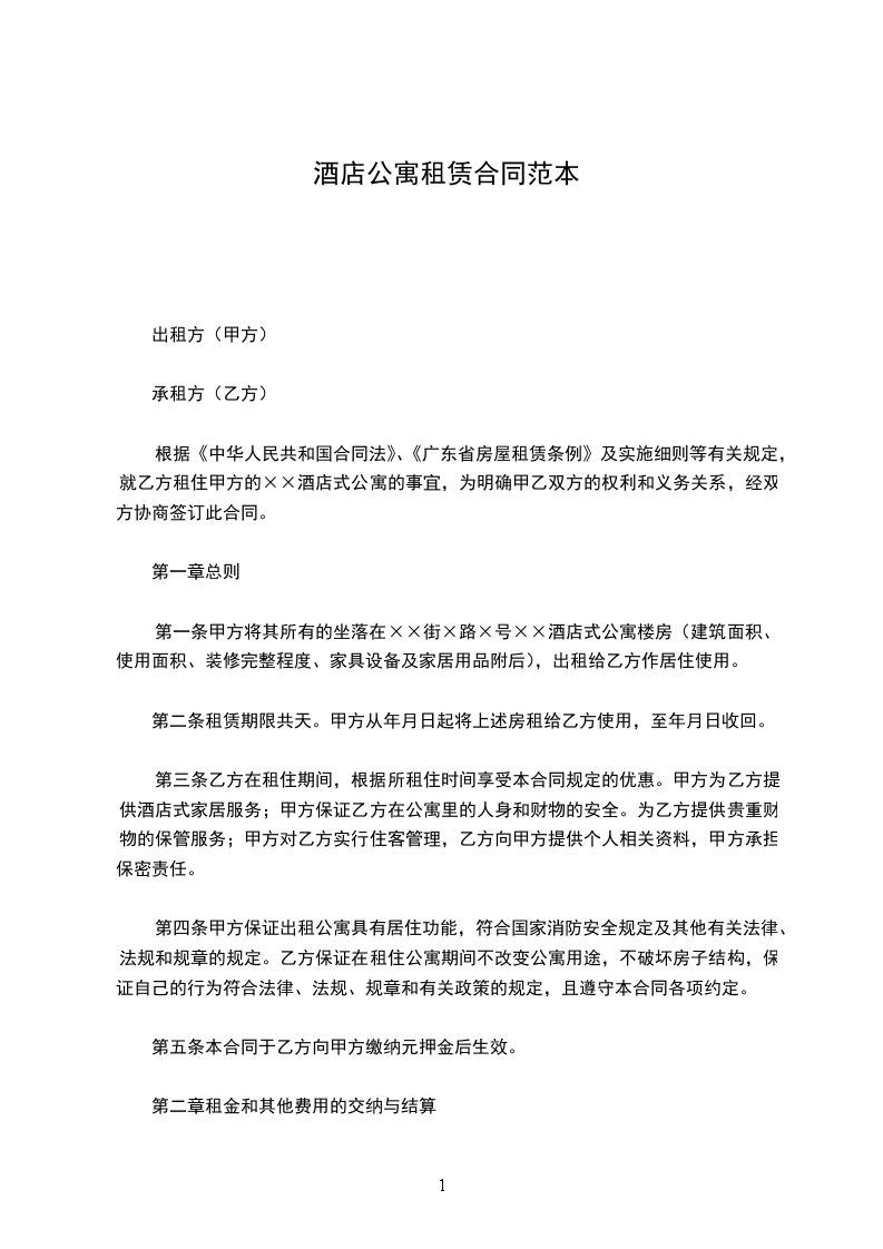 根据《中华人民共和国民法典》、《广东省房屋租赁条例》及实施细则等有关规定,就乙方租住甲方的××酒店式公寓的事宜,为明确甲乙双方的权利和义务关系,经双方协商签订此合同。