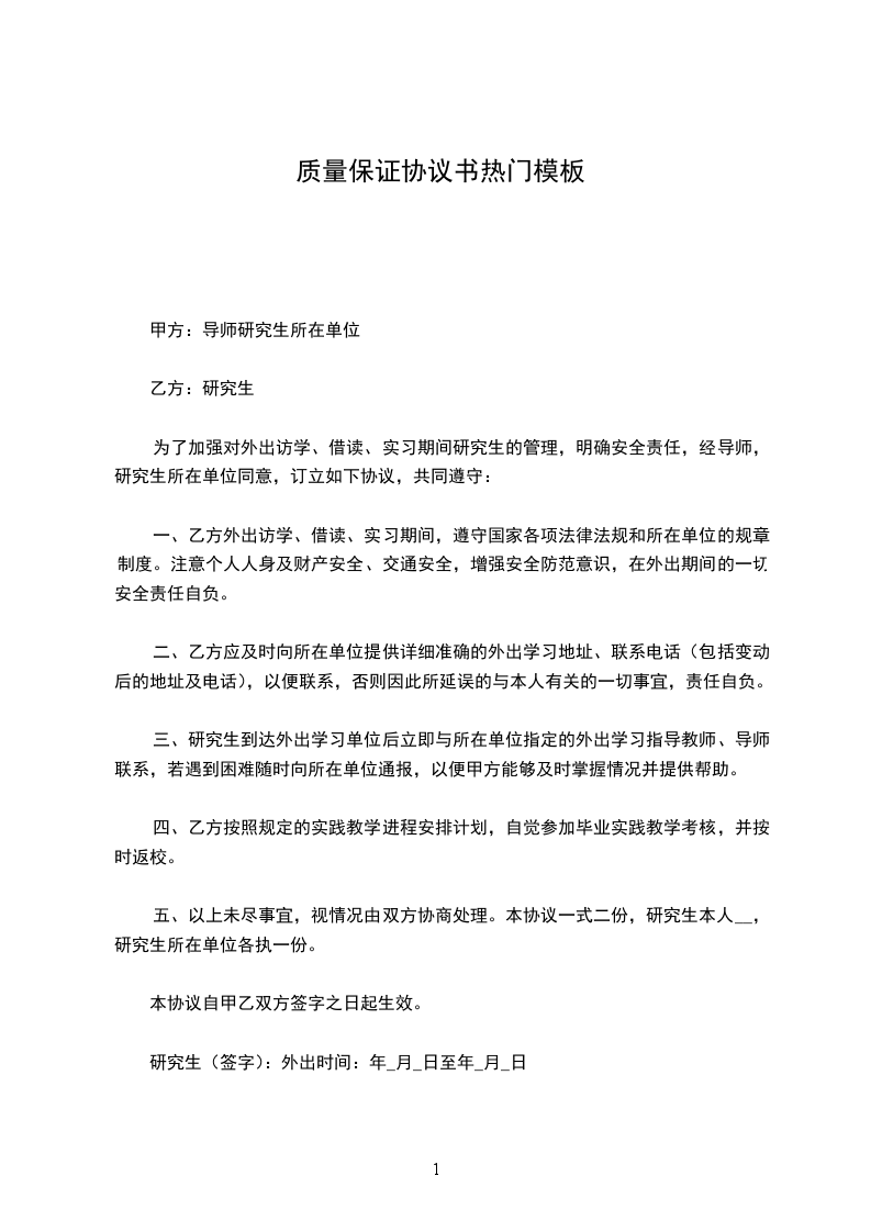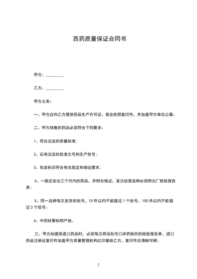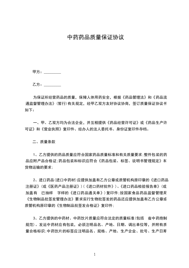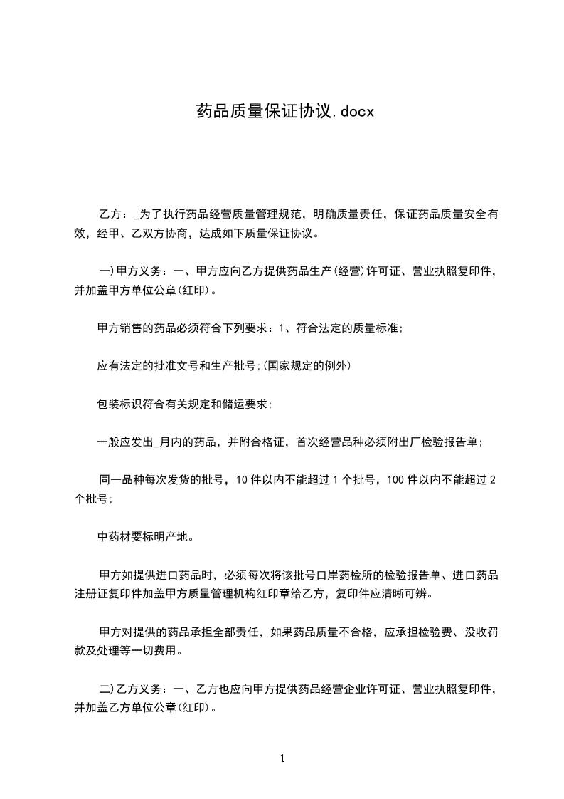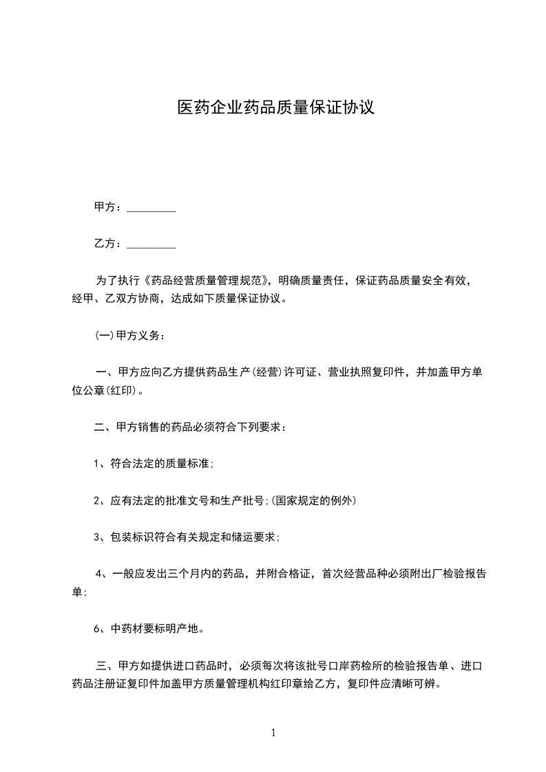 甲方:_________乙方:_________为了执行《药品经营质量管理规范》,明确质量责任,保证药品质量安全有效,经甲、乙双方协商,达成如下质量保证协议。