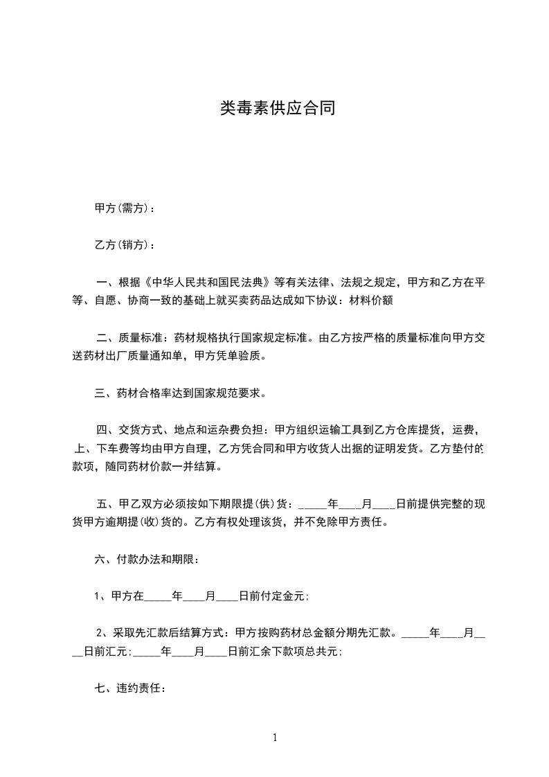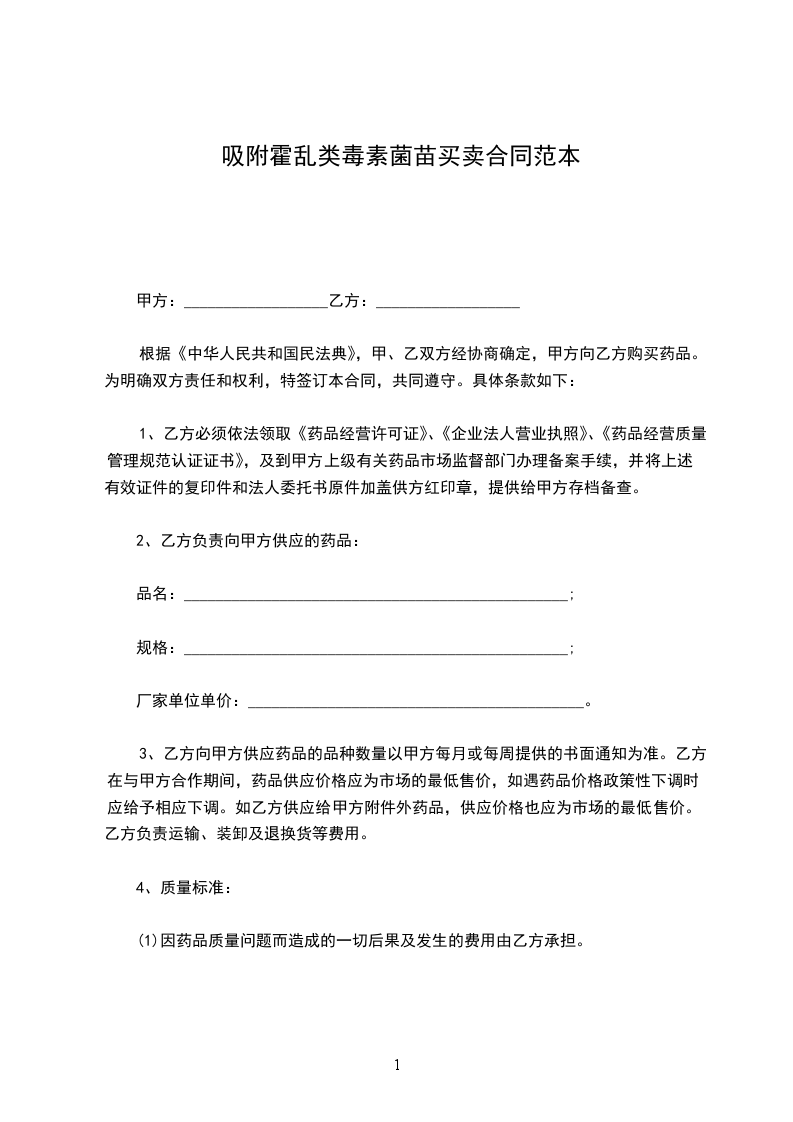 根据《中华人民共和国民法典》,甲、乙双方经协商确定,甲方向乙方购买药品。为明确双方责任和权利,特签订本合同,共同遵守。具体条款如下: