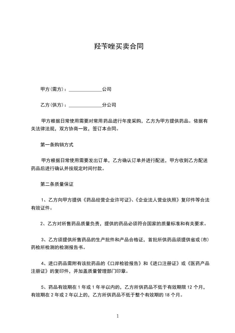 甲方根据日常使用需要对常用药品进行年度采购,乙方为甲方提供药品。依据有关法律法规,双方协商一致,签订本合同。
