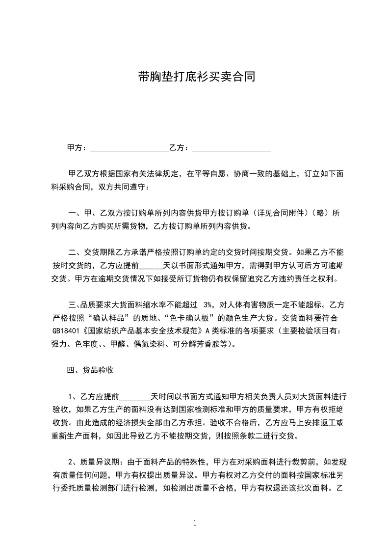 三、品质要求大货面料缩水率不能超过3%,对人体有害物质一定不能超标。乙方严格按照“确认样品”的质地、“色卡确认板”的颜色生产大货。交货面料要符合GB18401《国家纺织产品基本安全技术规范》A类标准的各项要求(主要检验项目有:强力、色牢度、、甲醛、偶氮染料、可分解芳香胺等)。
