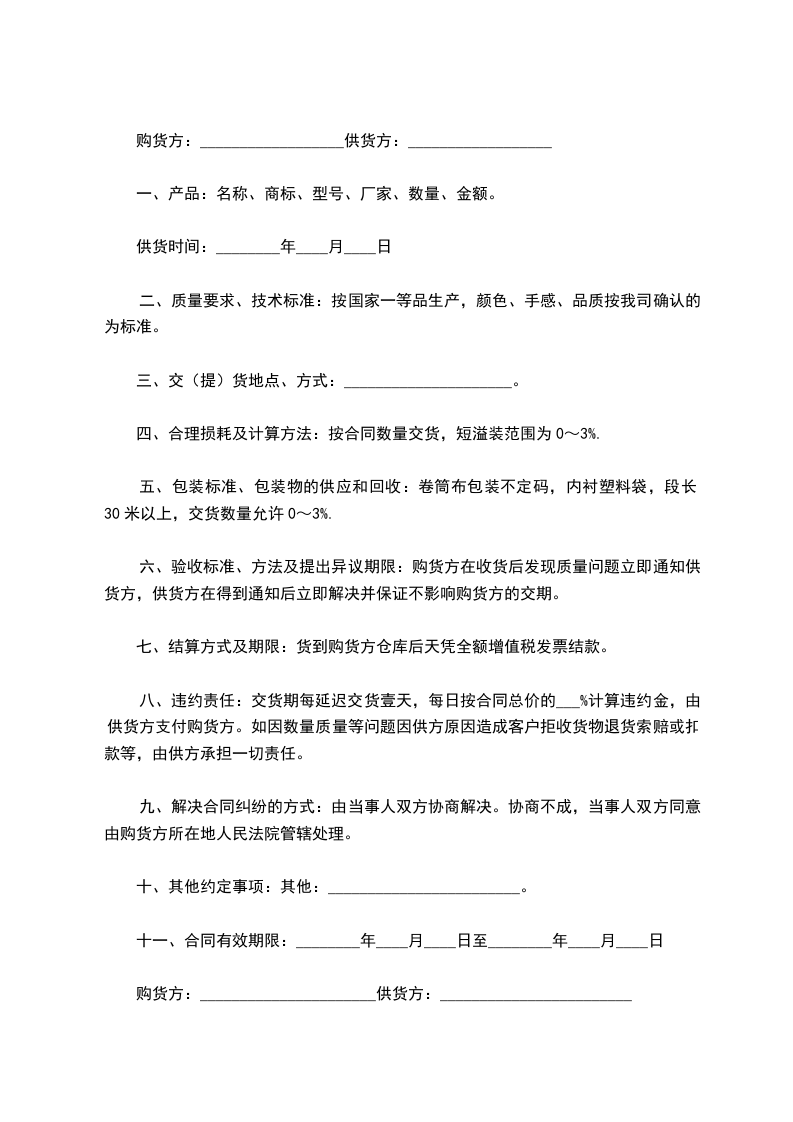 五、包装标准、包装物的供应和回收:卷筒布包装不定码,内衬塑料袋,段长30米以上,交货数量允许0~3%.