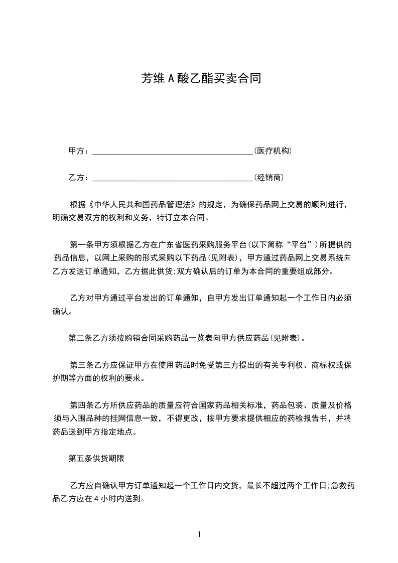 第一条甲方须根据乙方在广东省医药采购服务平台(以下简称“平台”)所提供的药品信息,以网上采购的形式采购以下药品(见附表),甲方通过药品网上交易系统向乙方发送订单通知,乙方据此供货;双方确认后的订单为本合同的重要组成部分。