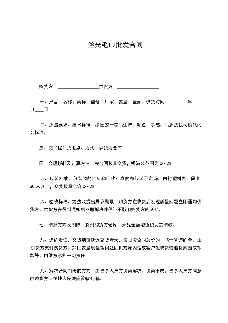 八、违约责任:交货期每延迟交货壹天,每日按合同总价的___%计算违约金,由供货方支付购货方。如因数量质量等问题因供方原因造成客户拒收货物退货索赔或扣款等,由供方承担一切责任。