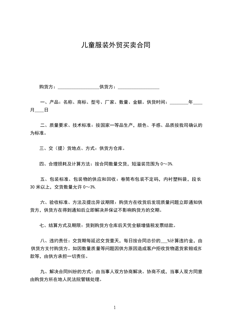 八、违约责任:交货期每延迟交货壹天,每日按合同总价的___%计算违约金,由供货方支付购货方。如因数量质量等问题因供方原因造成客户拒收货物退货索赔或扣款等,由供方承担一切责任。