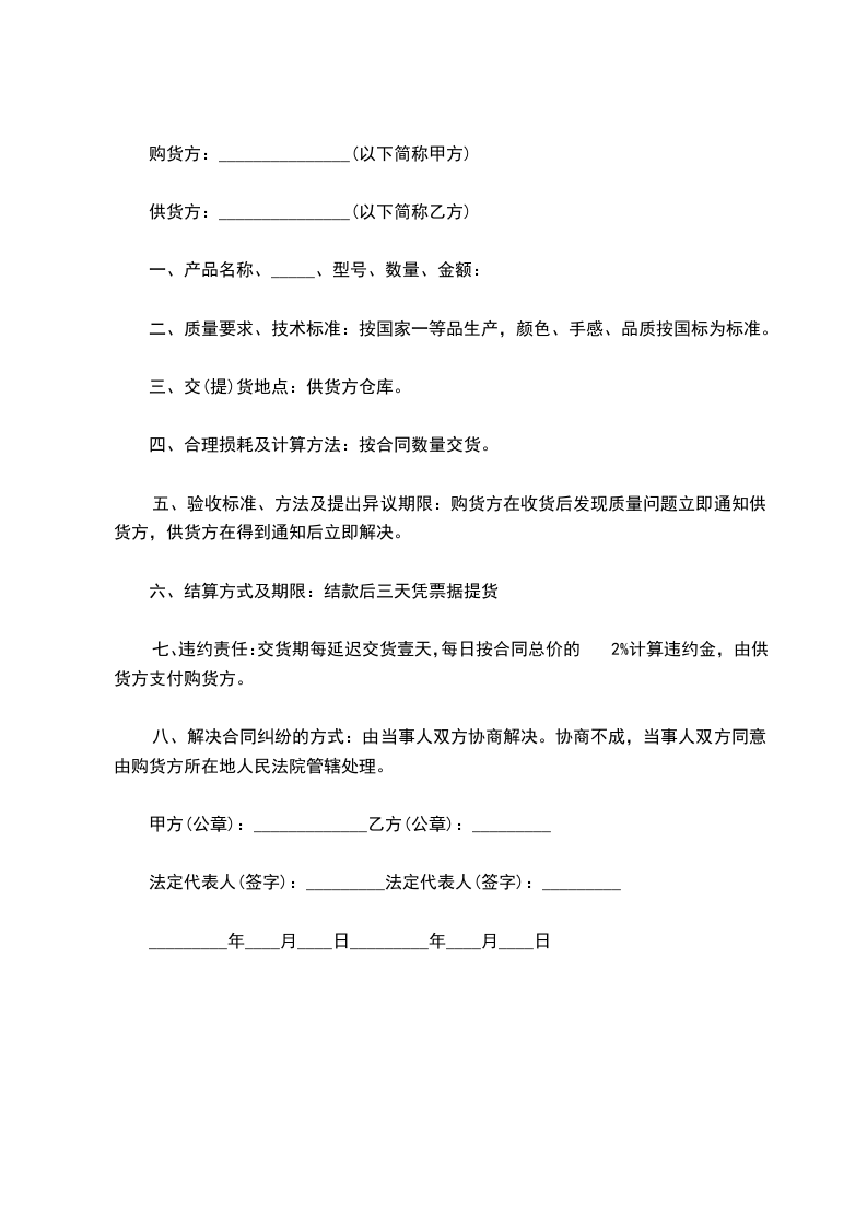 2按此合同交货日期,按时交货。如未按时交货,甲方将扣除乙方千分之二/每日的货款作为违约金。