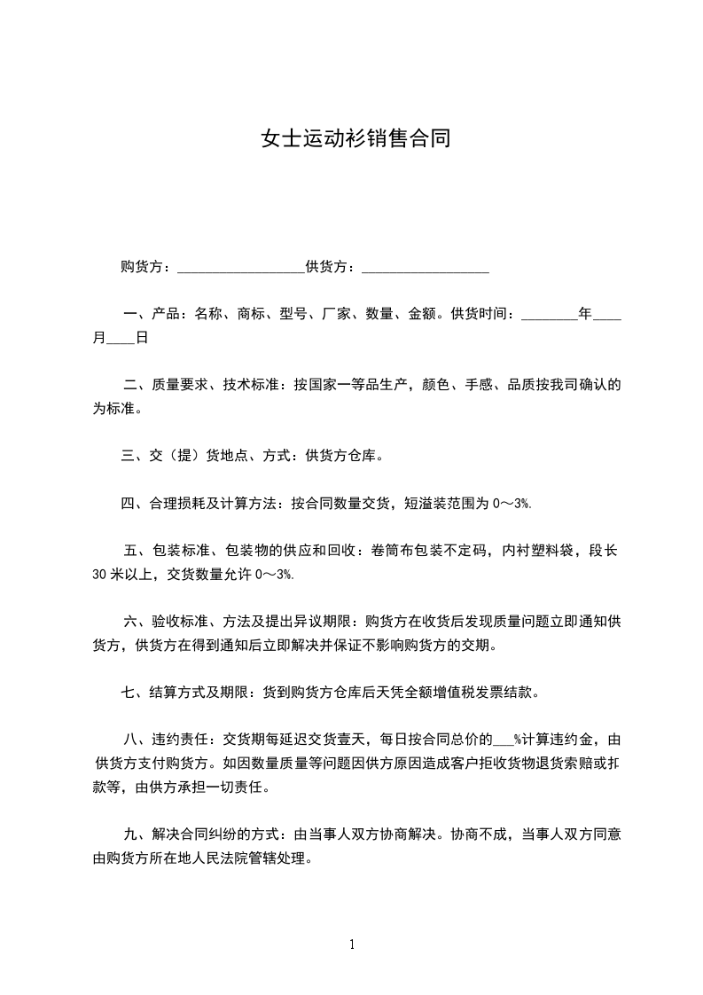 八、违约责任:交货期每延迟交货壹天,每日按合同总价的___%计算违约金,由供货方支付购货方。如因数量质量等问题因供方原因造成客户拒收货物退货索赔或扣款等,由供方承担一切责任。