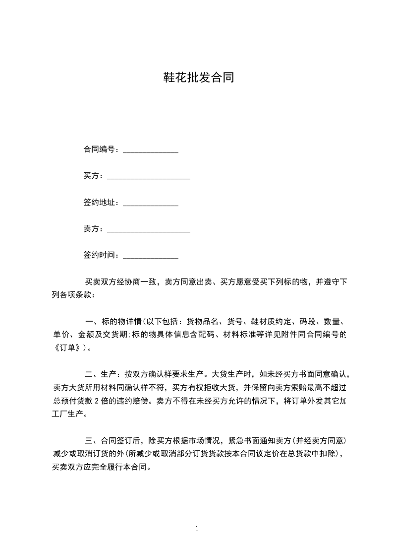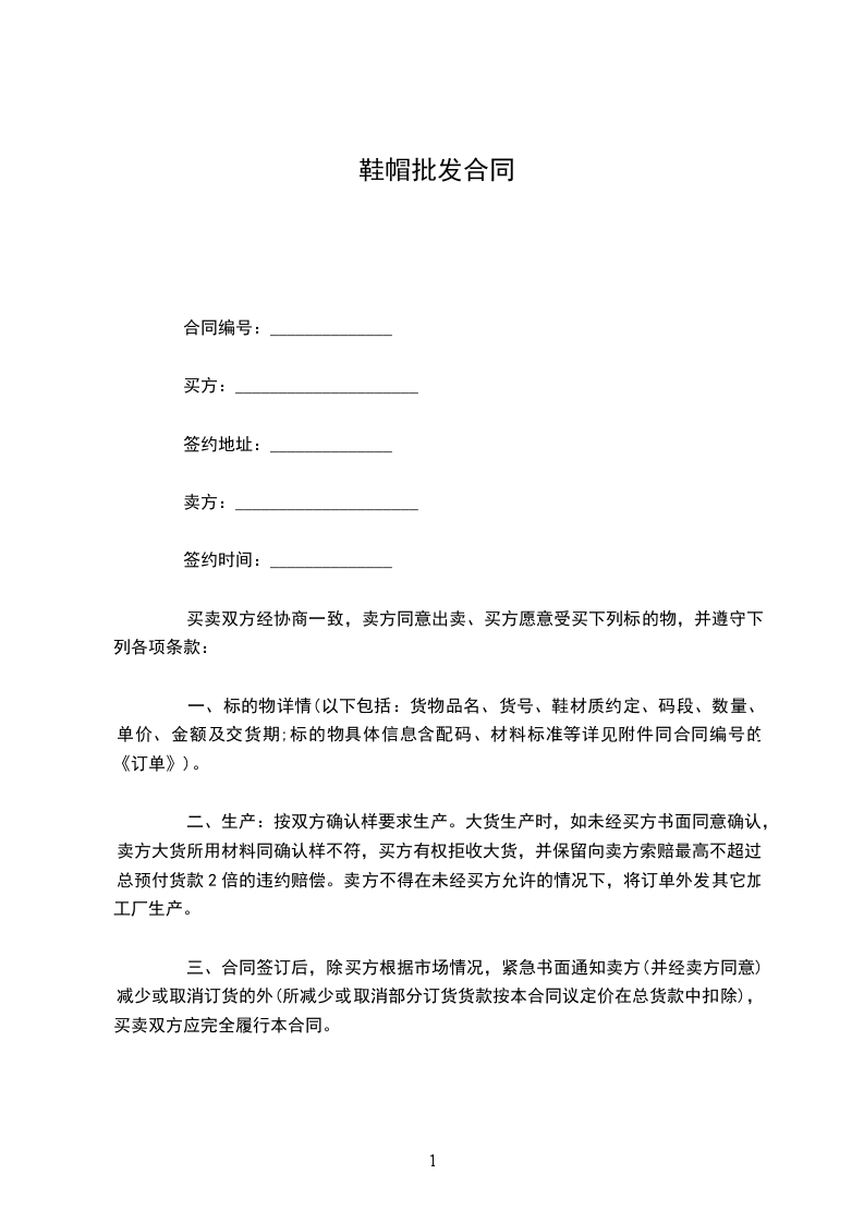 二、生产:按双方确认样要求生产。大货生产时,如未经买方书面同意确认,卖方大货所用材料同确认样不符,买方有权拒收大货,并保留向卖方索赔最高不超过总预付货款2倍的违约赔偿。卖方不得在未经买方允许的情况下,将订单外发其它加工厂生产。