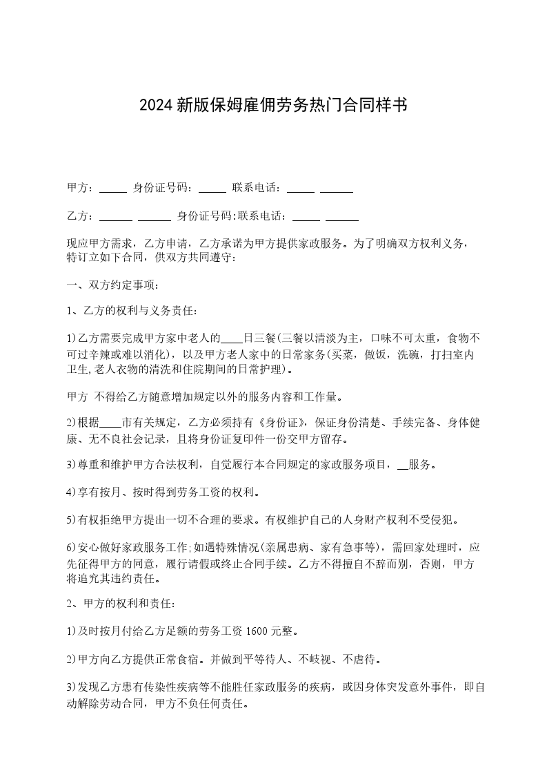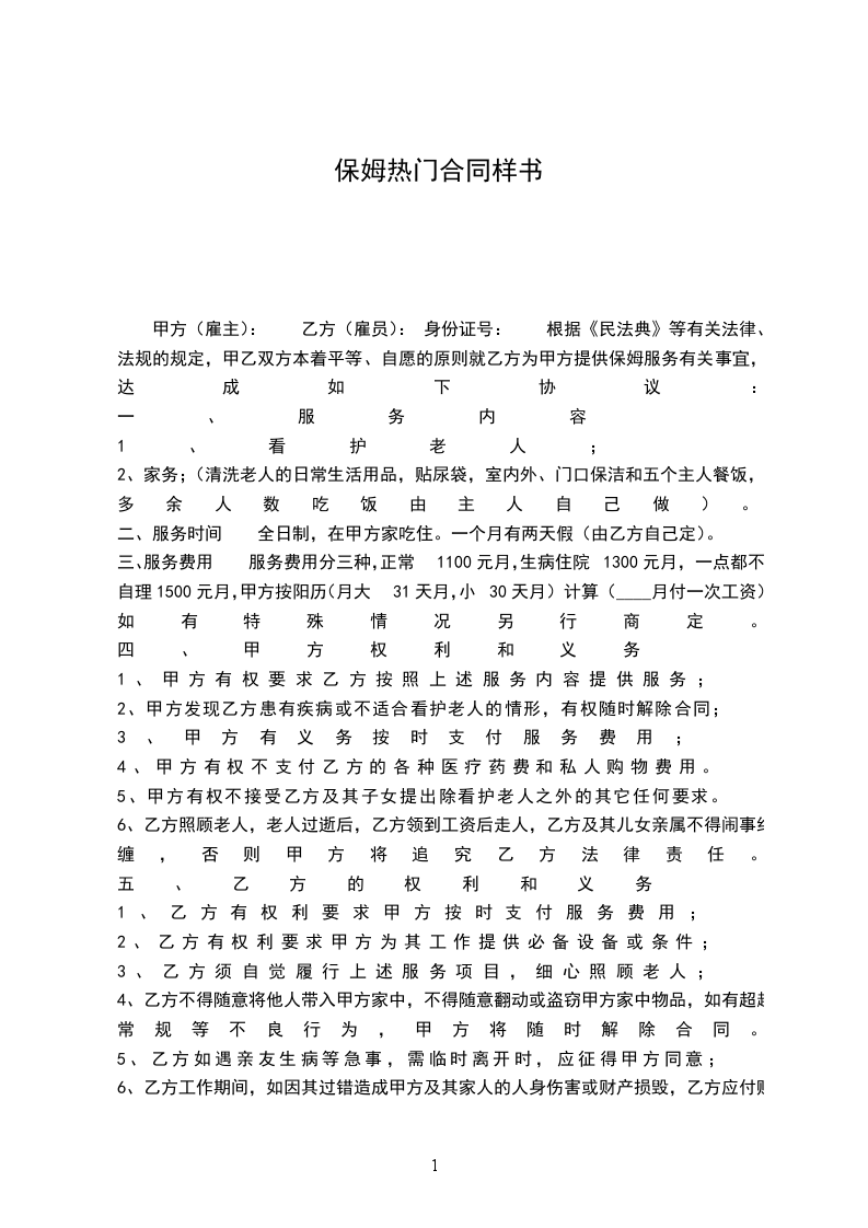 甲方(雇主): 乙方(雇员): 身份证号: 根据《民法典》等有关法律、法规的规定,甲乙双方本着平等、自愿的原则就乙方为甲方提供保姆服务有关事宜,达成如下协议: