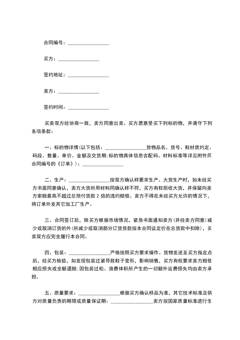 四、包装:严格按照买方要求操作。货物发送至买方指定点后,经买方检验,如发现包装过紧导致鞋子变形,影响销售,买方有权要求卖方赔偿相应损失或全额退赔;因包装过松、浪费体积所产生的一切额外运费损失均由卖方承担。