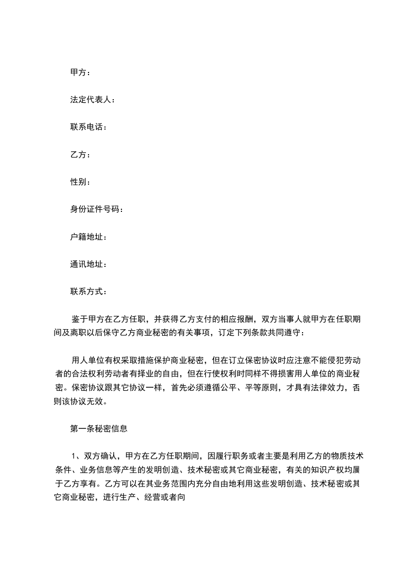 甲方:法定代表人:联系电话:乙方:性别:身份证件号码: 户籍地址:通讯地址:联系方式:甲乙双方就乙方在任职期间及离职以后的保密及竞业限制事宜,达成以下条款,以共同遵守: