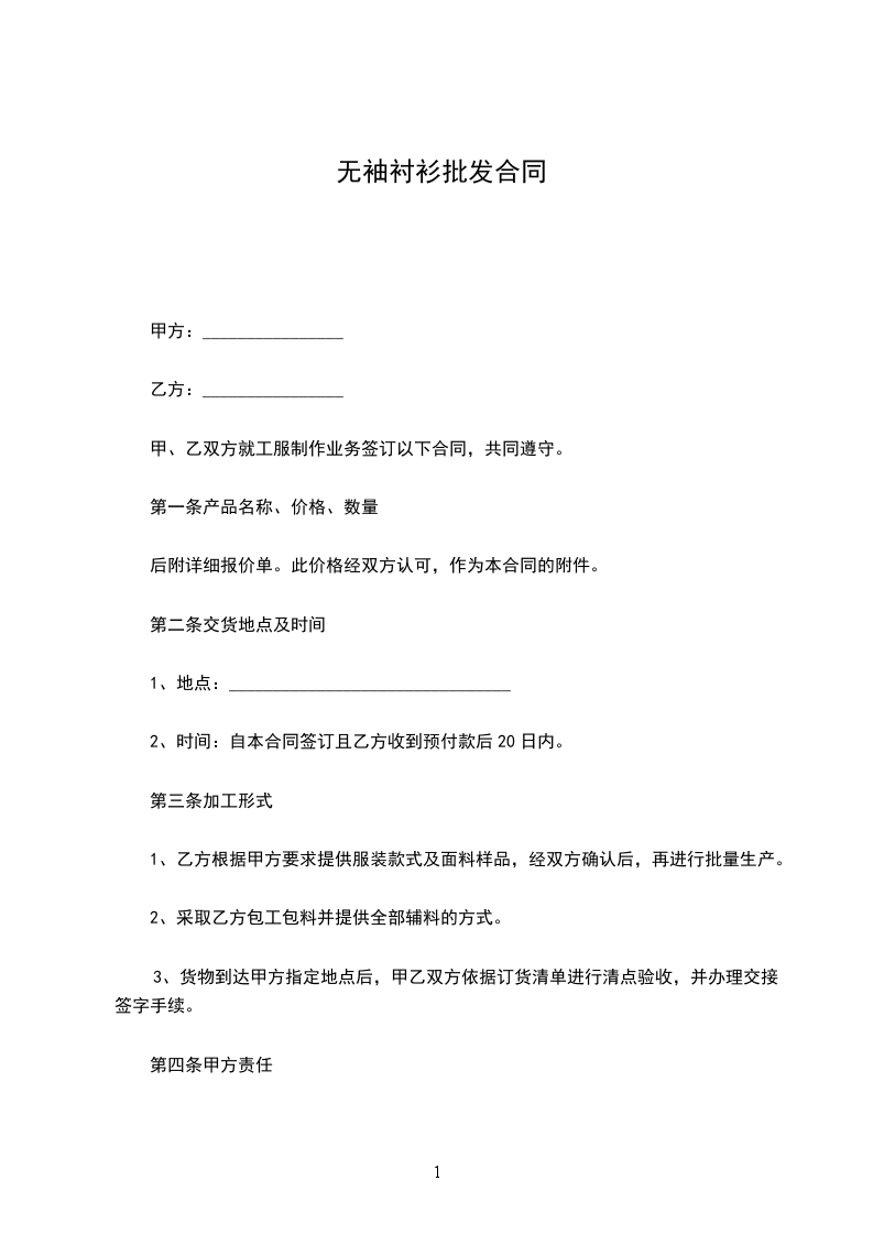 八、违约责任:交货期每延迟交货壹天,每日按合同总价的___%计算违约金,由供货方支付购货方。如因数量质量等问题因供方原因造成客户拒收货物退货索赔或扣款等,由供方承担一切责任。