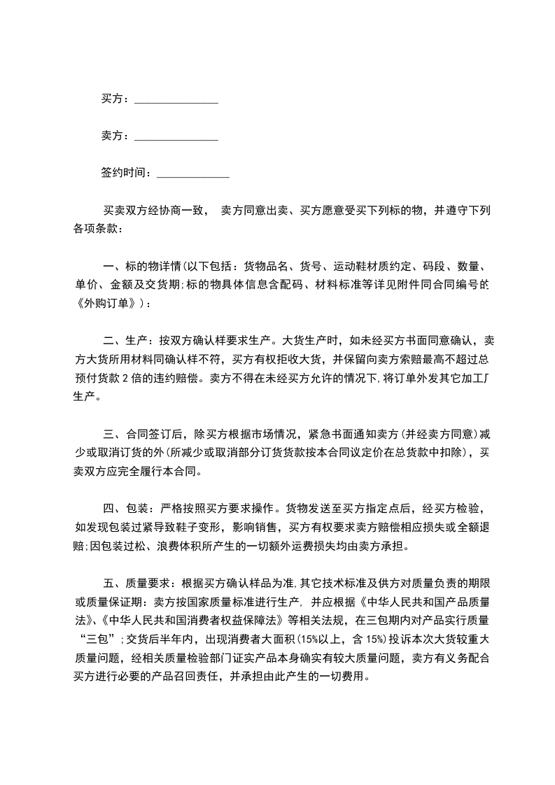 一、甲方将根据乙方提供的商品报价信息,就每一个特定商品的订货提交订货单,订货单上明确商品名称,规格,数量,包装,价格,交货地点,交货时间等条款。