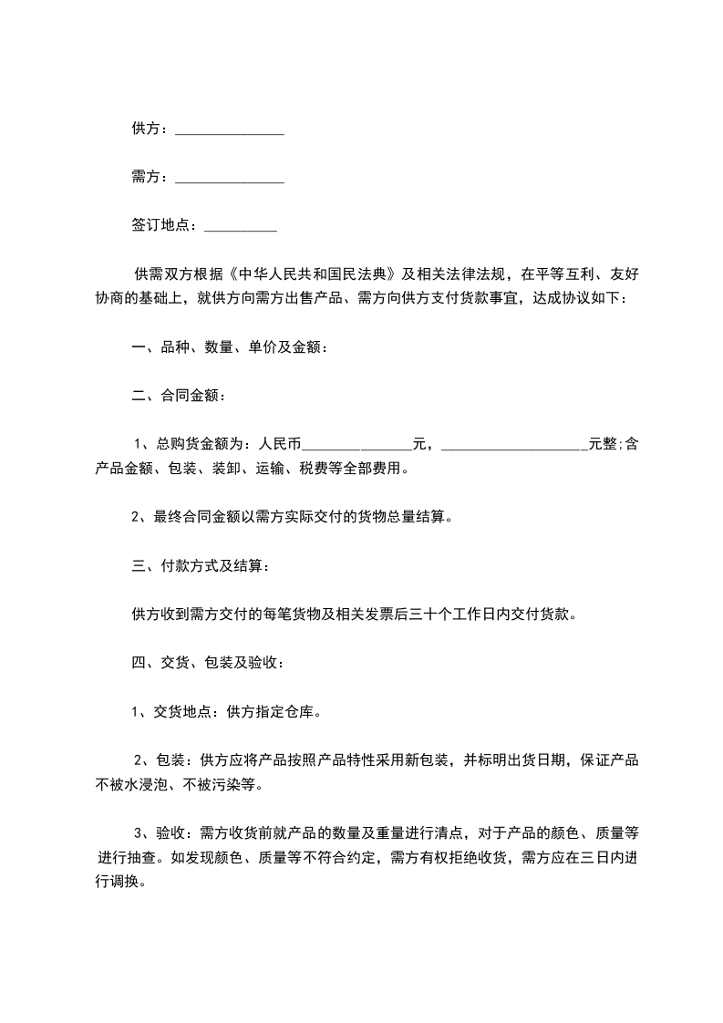 六、交货地点:卖方仓库。在某个批次货物验货通过后,买方根据实际情况安排是否直接从卖方仓库装运货物出货。卖方负责货物装箱工作。卖方在货物装箱时须要保证满箱出货。