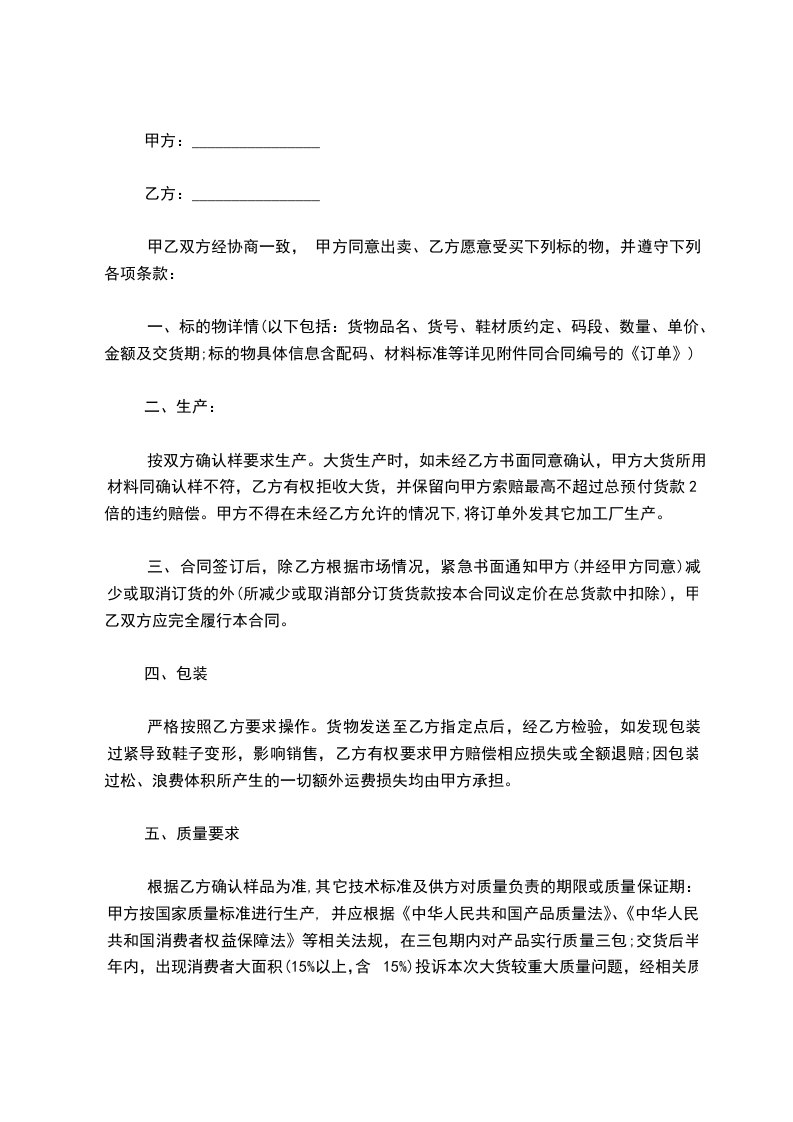 四、包装:严格按照买方要求操作。货物发送至买方指定点后,经买方检验,如发现包装过紧导致鞋子变形,影响销售,买方有权要求卖方赔偿相应损失或全额退赔;因包装过松、浪费体积所产生的一切额外运费损失均由卖方承担。