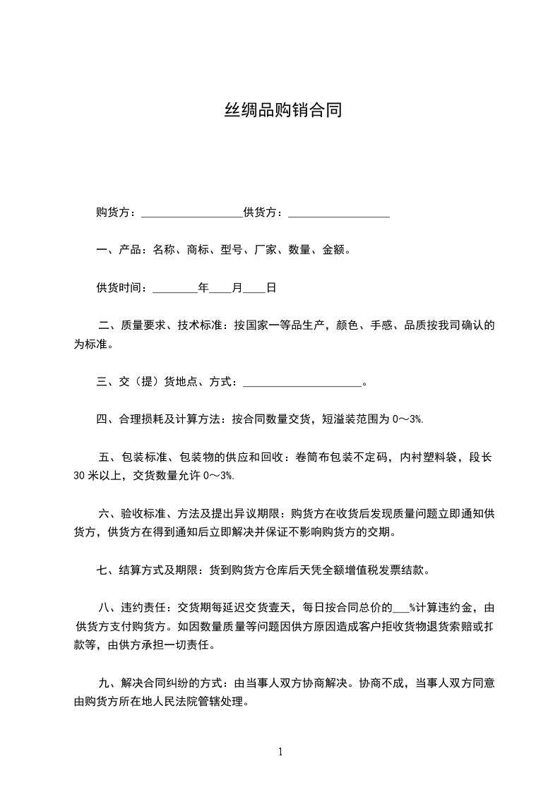 八、违约责任:交货期每延迟交货壹天,每日按合同总价的___%计算违约金,由供货方支付购货方。如因数量质量等问题因供方原因造成客户拒收货物退货索赔或扣款等,由供方承担一切责任。