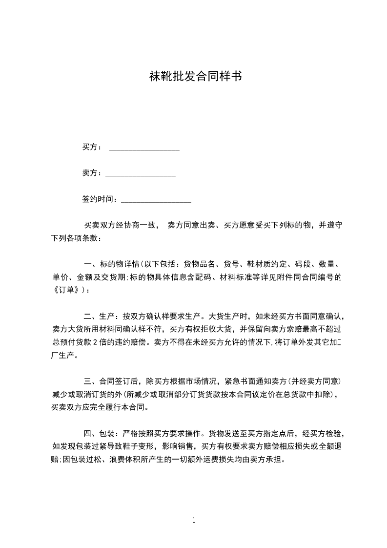 四、包装:严格按照买方要求操作。货物发送至买方指定点后,经买方检验,如发现包装过紧导致鞋子变形,影响销售,买方有权要求卖方赔偿相应损失或全额退赔;因包装过松、浪费体积所产生的一切额外运费损失均由卖方承担。