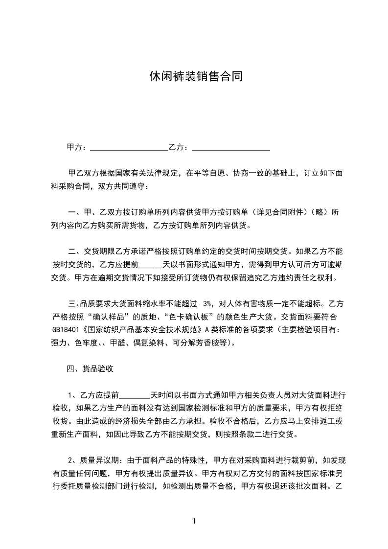 休闲插袋短裤购销合同