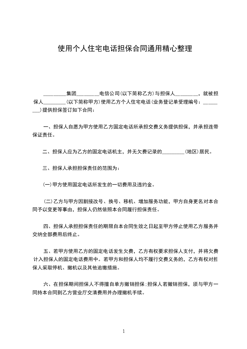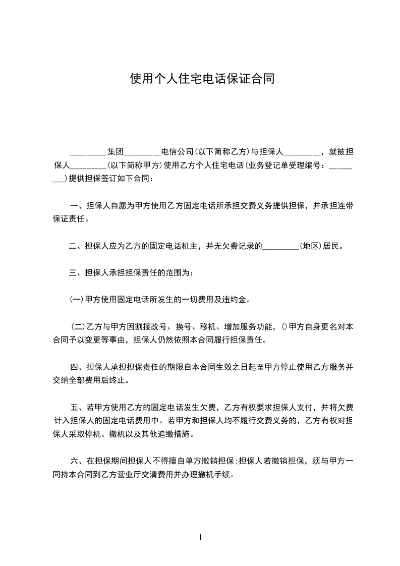 _________集团_________电信公司(以下简称乙方)与担保人_________,就被担保人_________(以下简称甲方)使用乙方个人住宅电话(业务登记单受理编号:_________)提供担保签订如下合同: