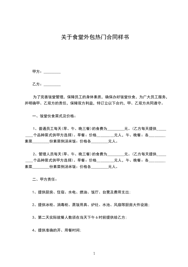 为了完善饭堂管理,保障员工的身体素质,确保办好饭堂伙食,为广大员工服务,并明确甲、乙双方的责任,保障双方利益,特订立以下合约,甲、乙双方共同遵守。